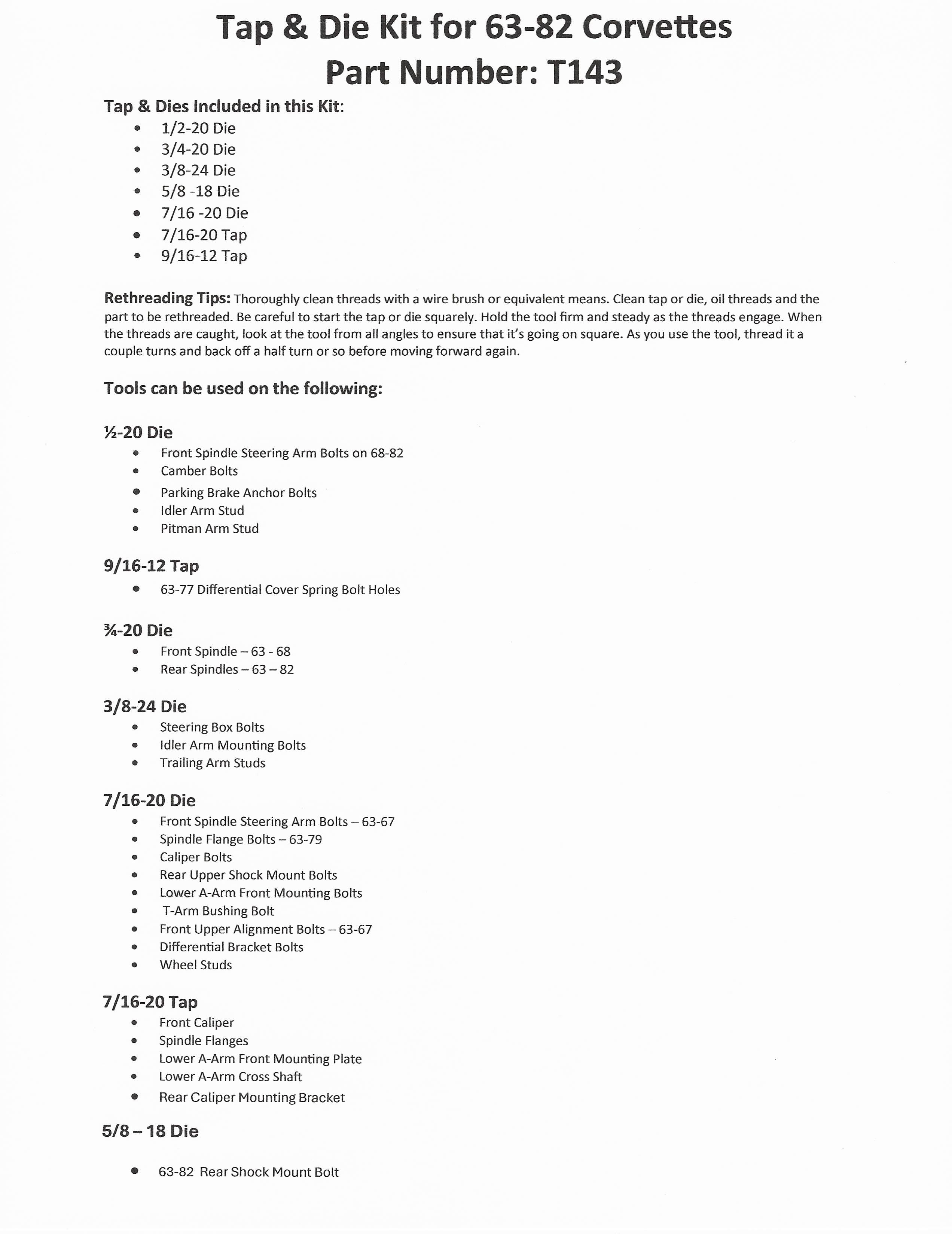Seven hard to find re-threader 2 taps & 5 die's most needed in Corvette suspension work. Complete with diagrams and service tips for use on approximately 85% of front and rear suspension